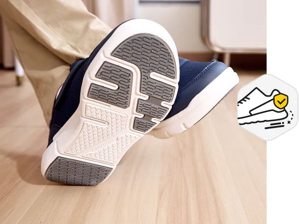 Pero lo que realmente distingue a estos zapatos son los detalles bien pensados: un antepié ancho y una parte superior transpirable mantienen a raya los dedos sobrecalentados. La talonera en forma de U, que distribuye uniformemente el impacto y la presión, puede aliviar rápidamente el dolor en el talón. Además, no te preocupes por el agarre: nuestra resistente suela de goma te mantiene estable sobre tus pies.