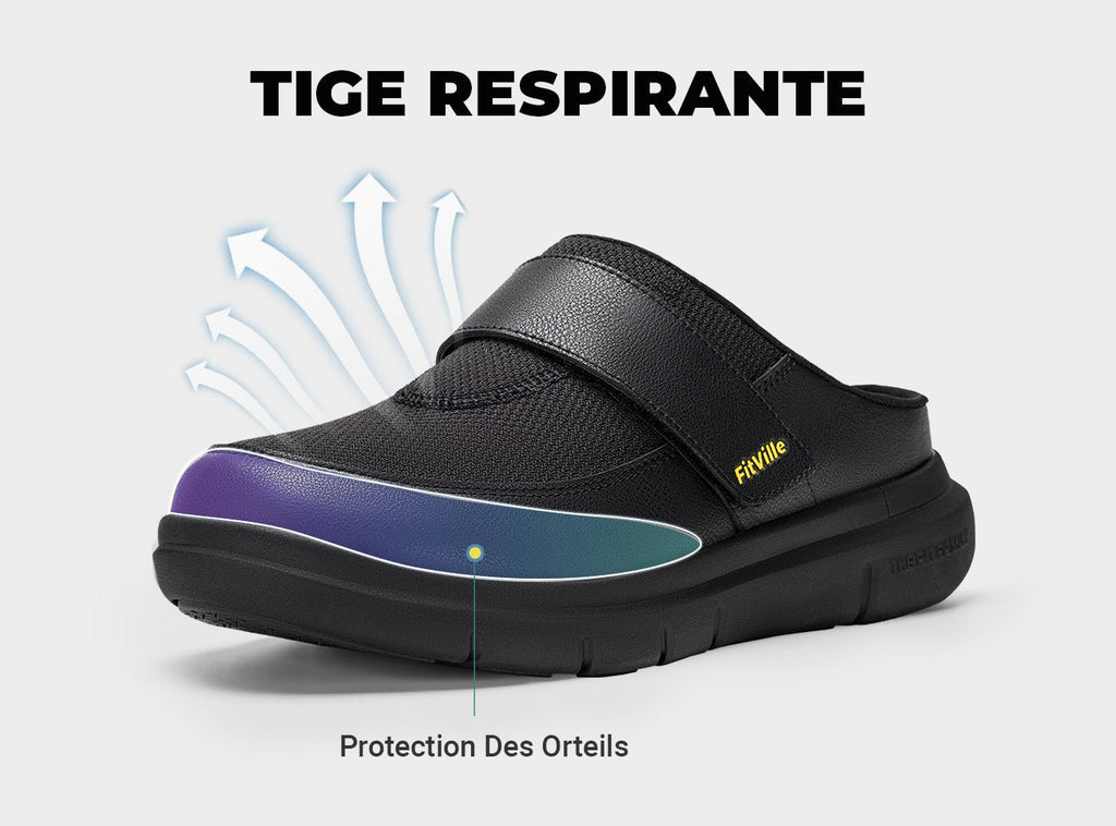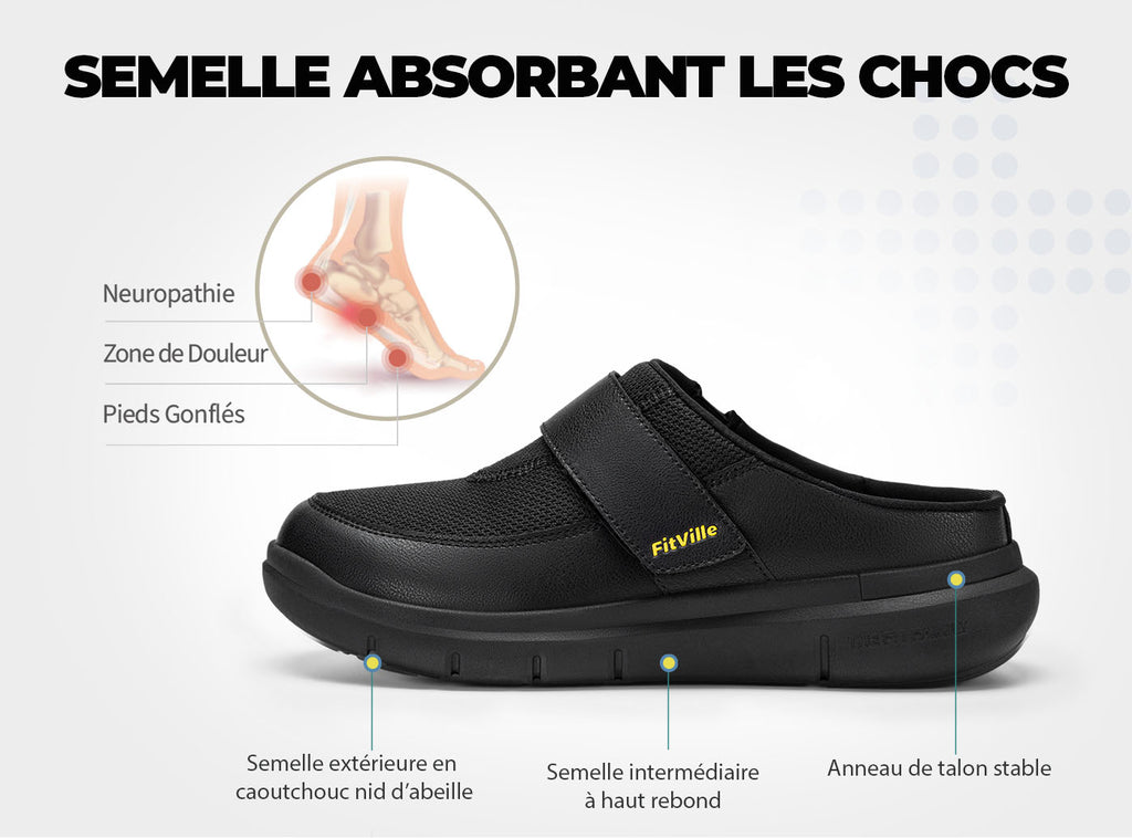 Chaque paire de chaussures pour diabétiques FitVille est conçue pour un confort immédiat, sans période d'adaptation. Les talons sont rembourrés avec une éponge douce et l'intérieur est doublé d'un tissu soyeux, lisse et extensible pour un contact doux avec la peau.