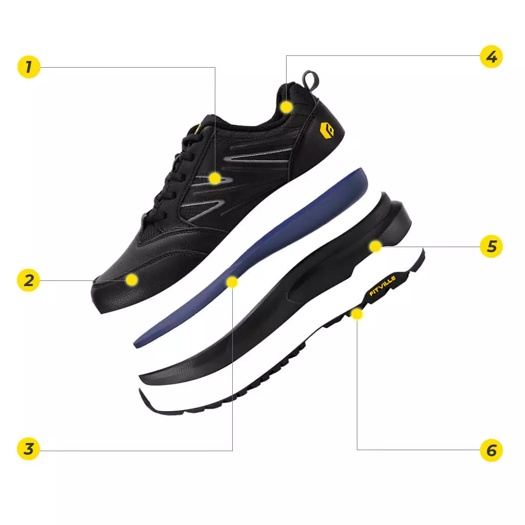 Con la tecnología ErgoFit™, los zapatos FitVille están diseñados ergonómicamente y le ofrecen una experiencia de ajuste increíble. La amortiguación elástica minimiza el impacto y maximiza la estabilidad.