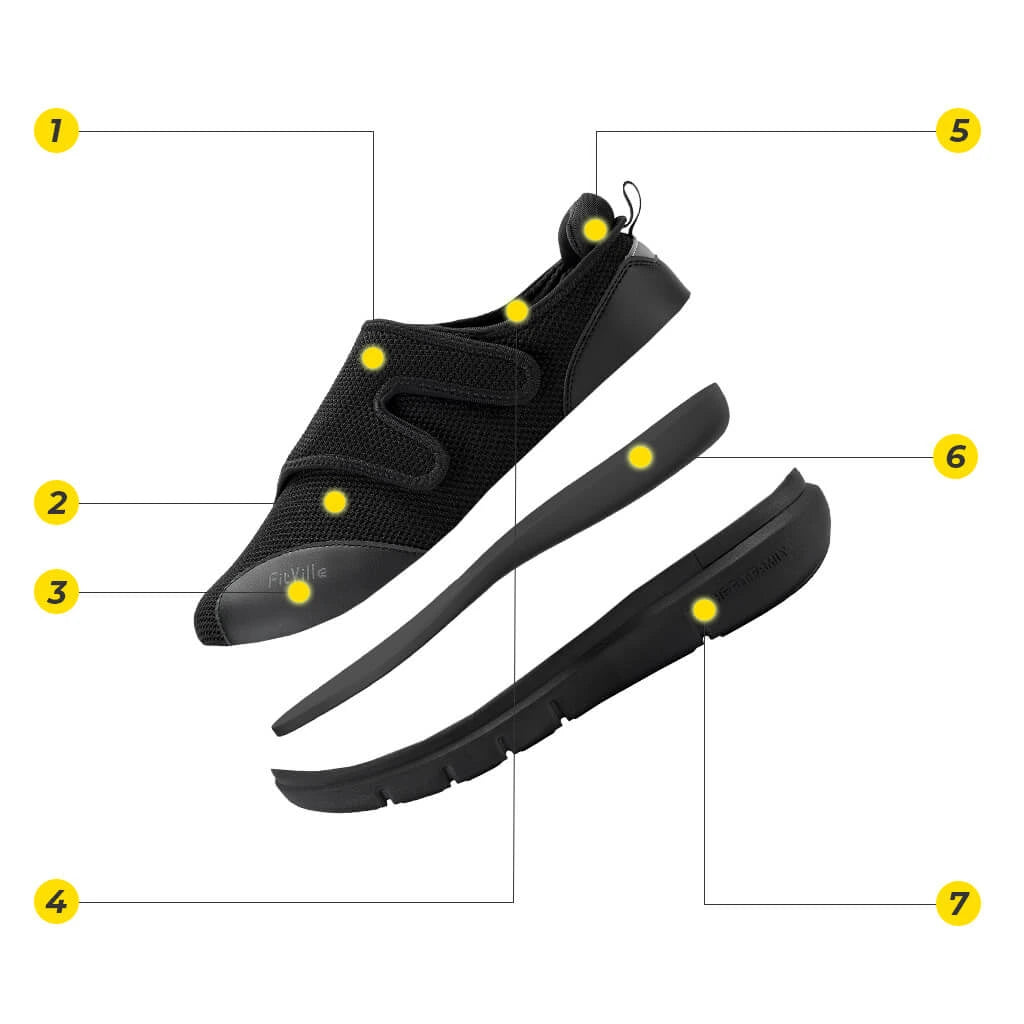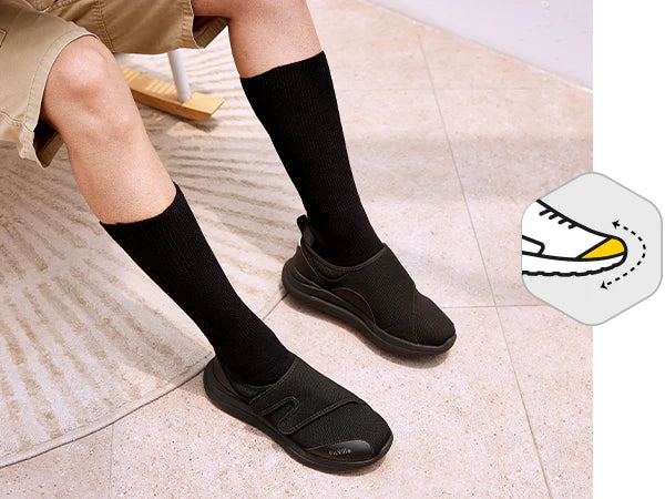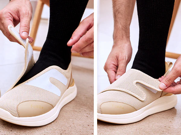Prova il massimo comfort e sollievo con le scarpe per diabetici FitVille EasyTop®. Queste scarpe sono il tuo biglietto per la felicità dei piedi, soprattutto se hai i piedi gonfi o sensibili. Immagina: una punta extra larga e un collo del piede alto che culla delicatamente i tuoi piedi, dando loro il supporto e lo spazio di cui hanno bisogno.