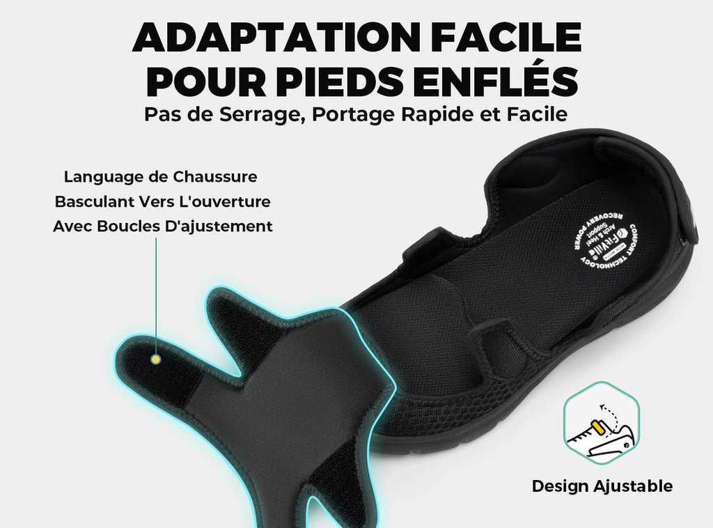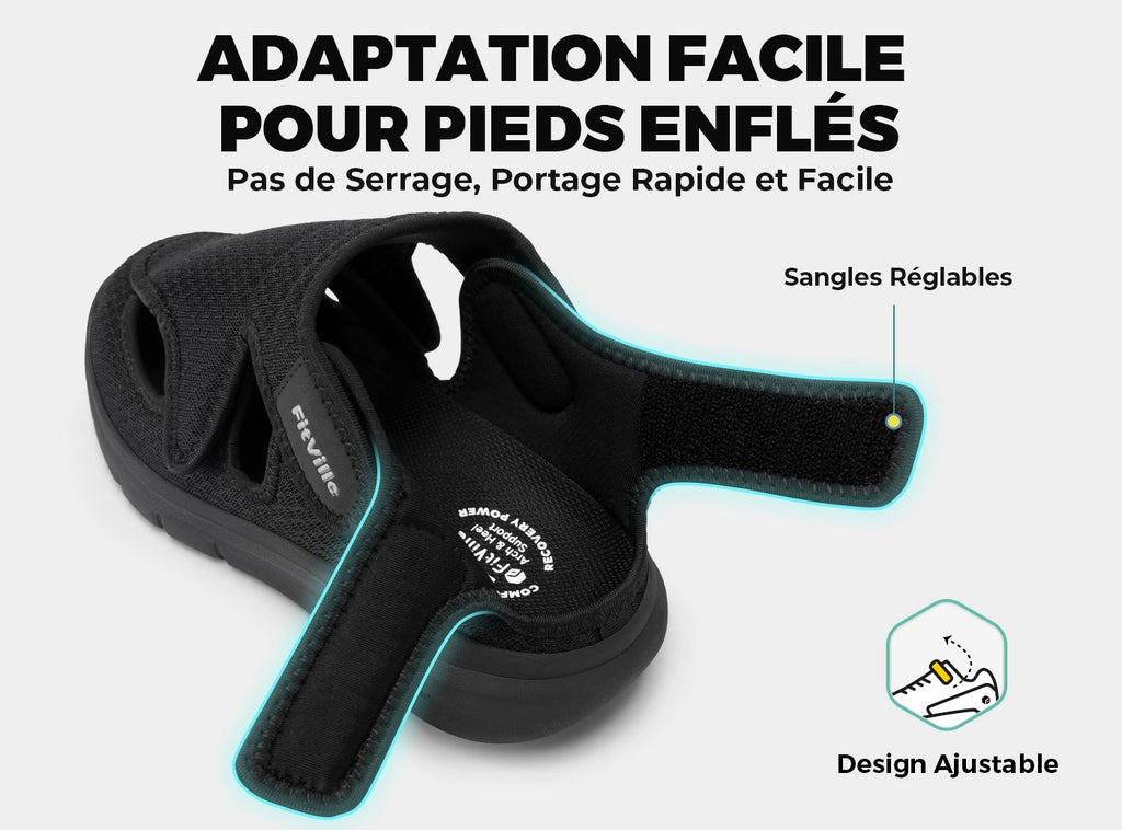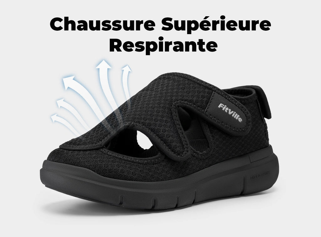Pour les diabétiques, le soutien de la voûte plantaire dans les sandales orthopédiques est essentiel pour maintenir les pieds correctement alignés et stables. Les sandales FitVille sont conçues avec une voûte plantaire surélevée et une coque de talon en forme de U pour cela. Elles offrent un ajustement confortable, aident à maintenir une démarche équilibrée et répartissent uniformément la pression pour soulager la fatigue et les douleurs au talon, contribuant ainsi à votre rétablissement.