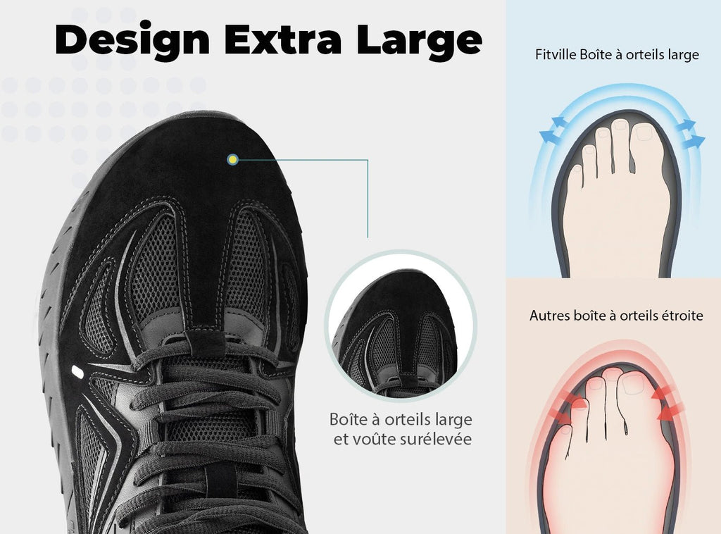 Le scarpe FitVille Rebound Core sono dotate di punta larga o extra larga per offrire il massimo comfort a persone con piedi larghi o medi.
