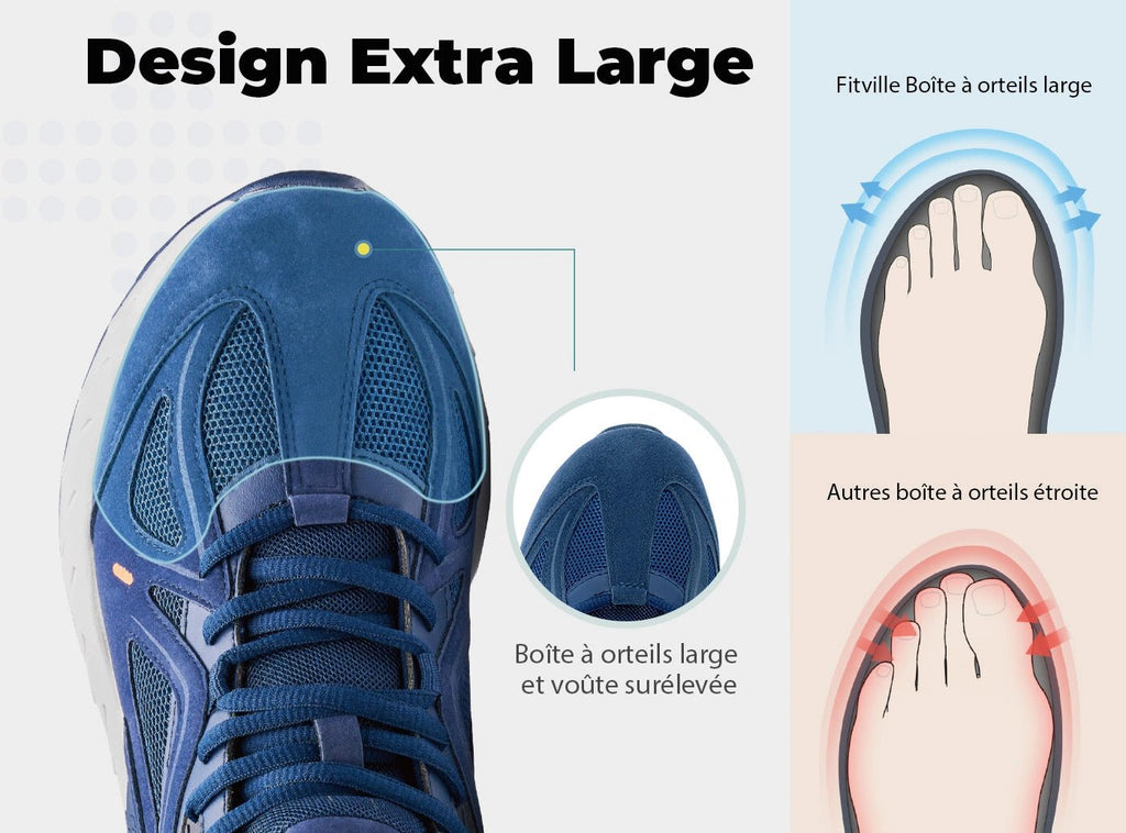 Le scarpe con una punta ampia riducono il rischio di borsiti, vesciche e altri problemi ai piedi causati da scarpe troppo strette.