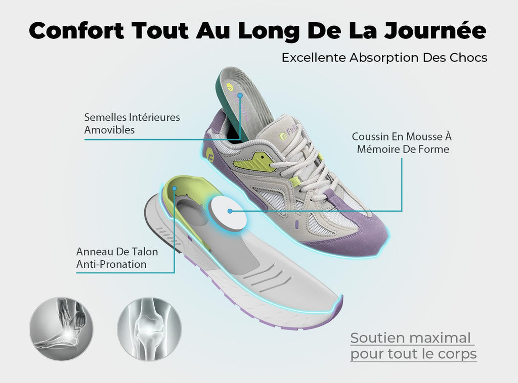 Le scarpe Rebound Core® di FitVille garantiscono 8 ore di camminata e posizione in piedi senza fatica! Queste scarpe approvate dai podologi ti terranno comodo tutto il giorno! Di' addio alle dita strette grazie all'area extra ampia dell'avampiede che stimola la circolazione sanguigna. Anche quando la fatica comincia a farsi sentire, il nostro innovativo anello sul tallone mantiene una postura di camminata costante, mantenendoti stabile in piedi.