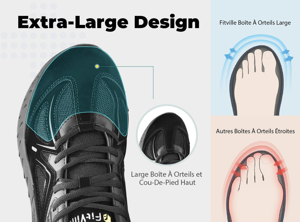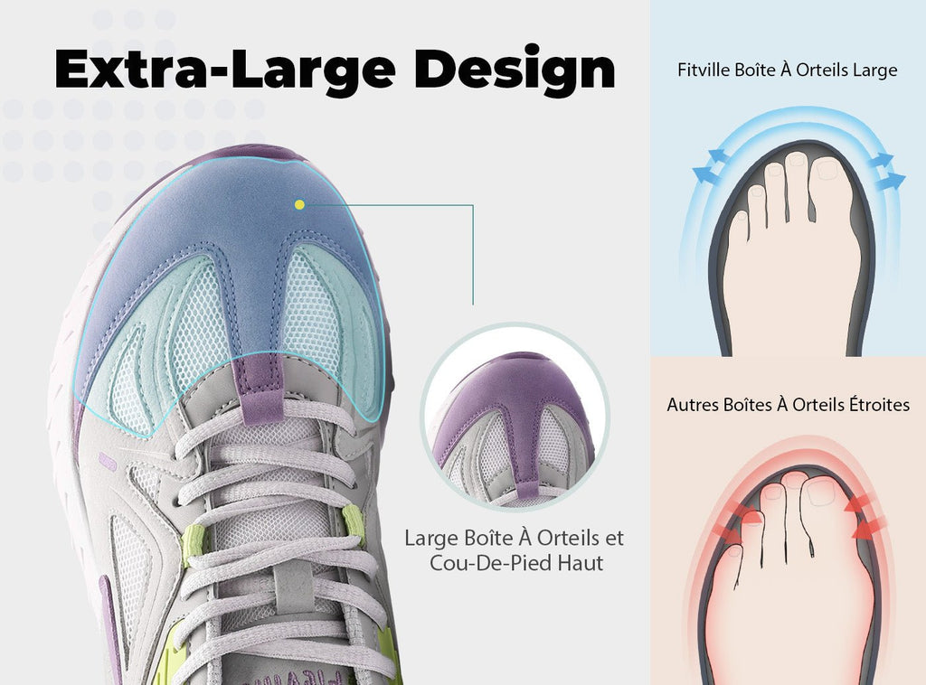 Le scarpe con una punta ampia riducono il rischio di borsiti, vesciche e altri problemi ai piedi causati da scarpe troppo strette.