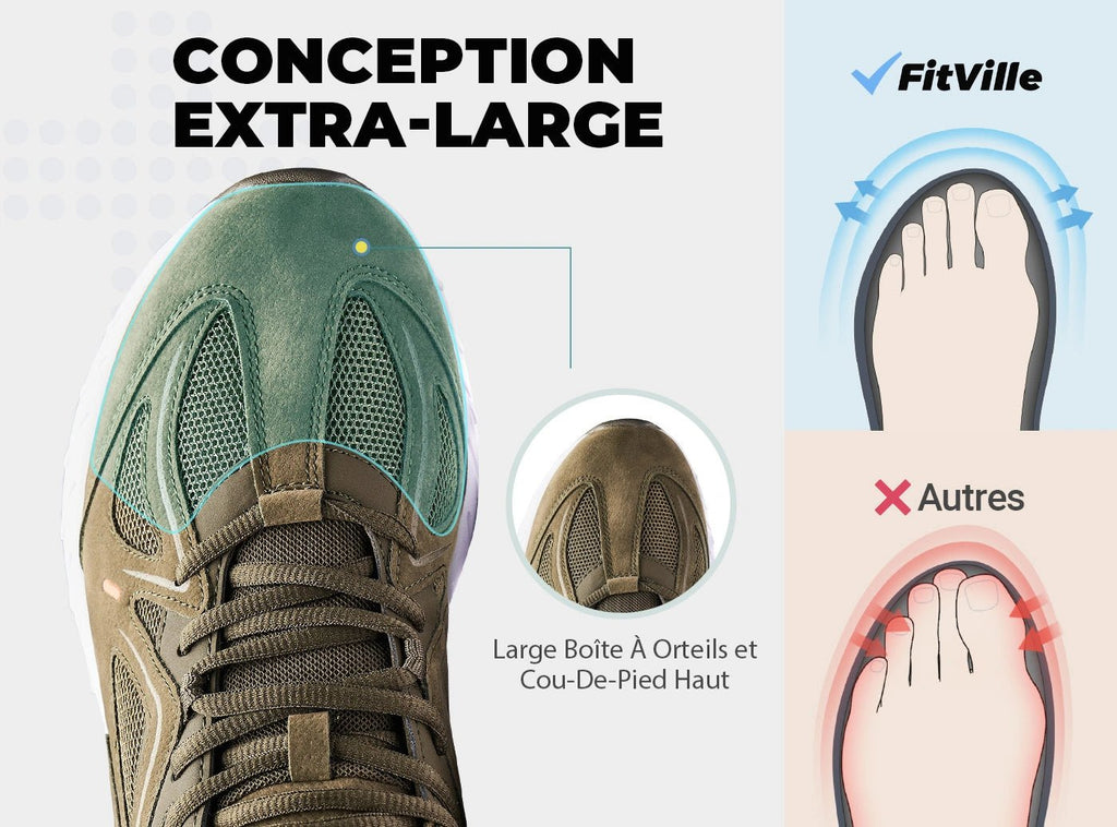 La tecnologia FitVille Comfort+™ mette il comfort al servizio del movimento. Questa tecnologia avanzata segue il contorno dei tuoi piedi per migliorare i tuoi movimenti.