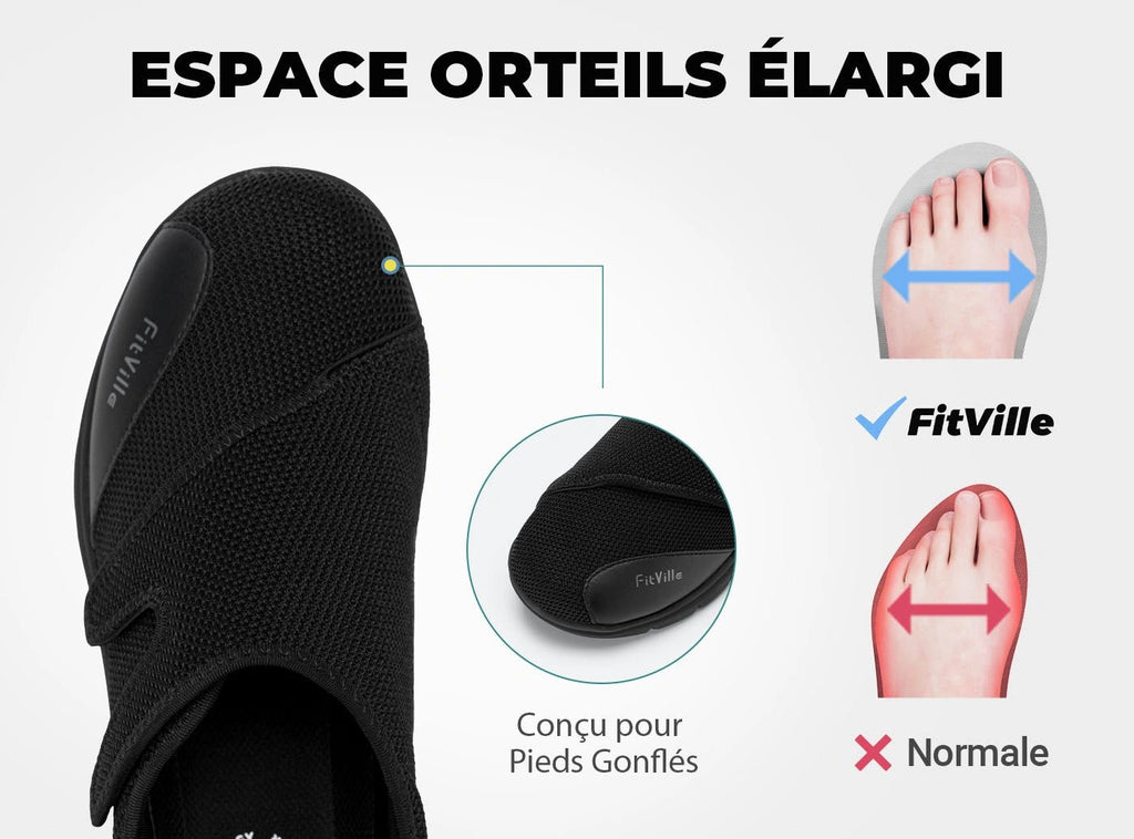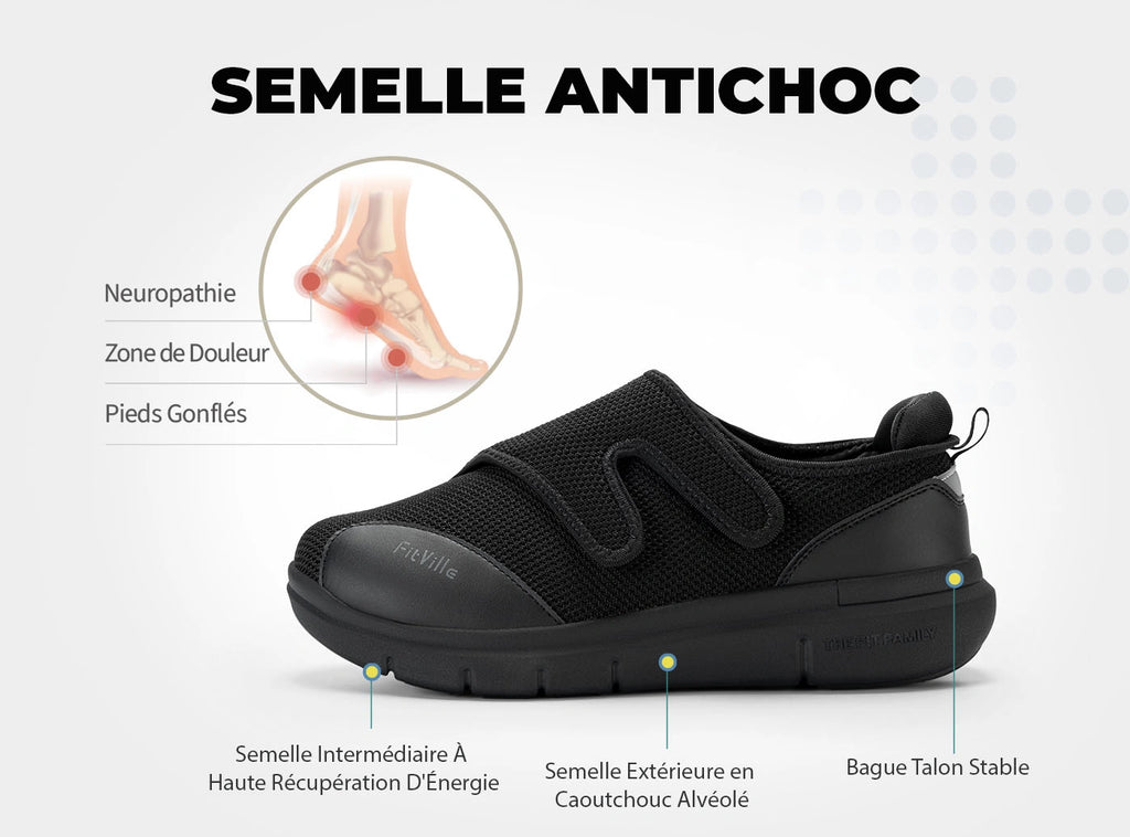 Faites l'expérience du confort et du soulagement ultimes avec les chaussures pour diabétiques FitVille EasyTop®. Ces chaussures sont votre ticket pour le bonheur des pieds, surtout si vous avez des pieds gonflés ou sensibles. Imaginez : une boîte à orteils extra-large et un cou-de-pied haut qui berce délicatement vos pieds, leur offrant le soutien et l'espace dont ils ont besoin.