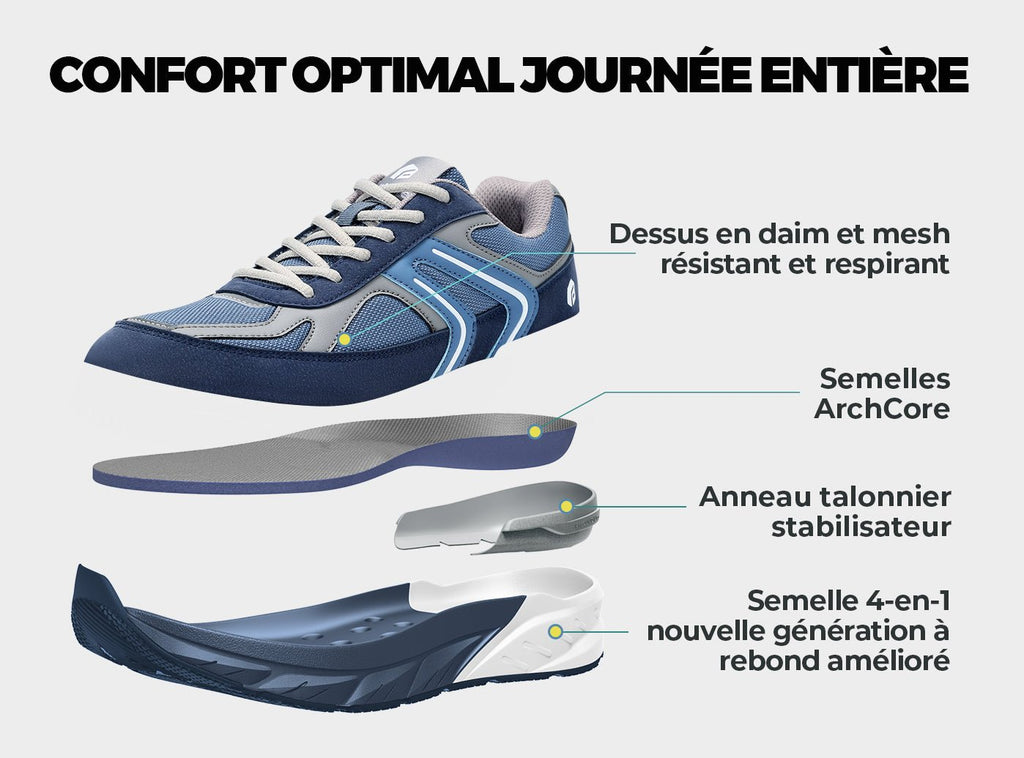 Mais ne vous inquiétez pas, nous avons aussi ce qu’il vous faut avec nos semelles ArchCore incluses, fabriquées en coton haute densité pour la respirabilité, l’absorption de la transpiration et la résistance aux odeurs. Elles sont conçues pour amortir et protéger vos articulations, avec une structure de talon en forme de U et un soutien de la voûte plantaire pour soulager la pression et l'inconfort. Cela signifie que vous pouvez profiter du confort et du soutien dès la première utilisation !