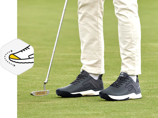 Swinguez avec style grâce à la chaussure de golf SpeedEx V2. La chaussure est disponible en version large et extra-large pour permettre aux joueurs d'avoir des pieds gonflés après une journée de golf. La semelle brevetée offre soutien et confort pour réduire la fatigue et vous permettre de garder toute votre énergie. La semelle intérieure respirante OrthoLite® favorise la circulation de l'air tout en offrant un excellent amorti et une bonne absorption des chocs. La semelle extérieure en caoutchouc antidérapant à six crampons offre une solide adhérence et une grande confiance en soi pour les 18 trous.