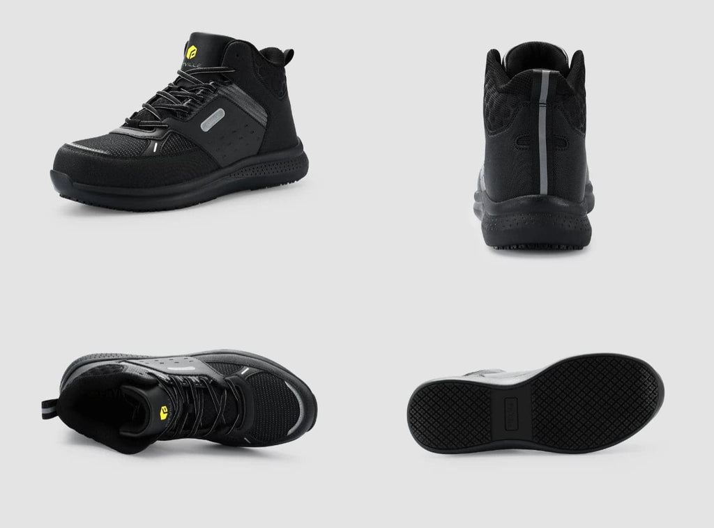 La FitVille High-top SteelCore vous permet de commencer et de terminer votre travail plus fort que jamais. Disponible en large et extra large, la boîte à orteils en composite solide avec matériau réfléchissant 3M permet non seulement à vos orteils de bouger librement, mais elle laisse également une distance de sécurité entre vos orteils et l'embout d'absorption des chocs. La semelle extérieure est résistante à l'eau et à l'huile, ce qui vous permet de rester sain et sauf en toutes circonstances. Sa robustesse, sa fiabilité et sa durabilité en font la chaussure idéale pour surmonter tous les obstacles au travail et aller de l'avant. De plus, le noyau composite du haut de la chaussure ajoute de la stabilité et protège votre cheville contre les blessures.